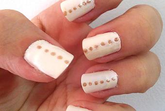 Los productos utilizados han sido por un lado para proteger la uña la base de Uñas delgadas de Masglo. Como base blanca utilicé un esmalte de Club. Sobre ese apliqué un esmalte de Catrice que deja un aspecto como escarchado pero que lamentablemente no se aprecia en las fotos. Con un esmalte dorado de Primark hice unos puntitos centrales en todas las uñas usando el accesorio que viene incluido en el esmalte. Finalmente cubrí todo con un top coat de Essence.
