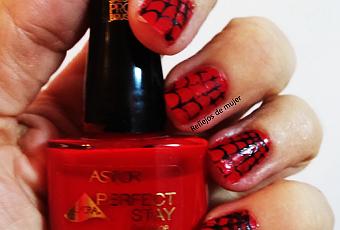 Para esta manicura el esmalte de base escogí de la línea Perfect Stay de Astor. Un rojo sangre precioso que me encanta y que combiné con una estampación de unas telarañas.