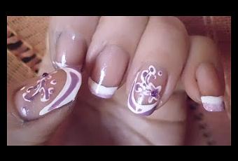 - Termina haciendo la flor con el esmalte blanco para dibujar y rellenandolo con algunas gotitas del esmalte morado para dibujar, usando la punta de metal.