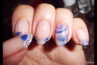 -Ponemos la hoja sobre la uña y vamos pegandola bien ayudandonos con un bastoncillo para los oidos. Lo pasamos por encima del papel y él solo se despegará en cuanto esté bien pegado a la uña.