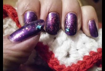 He puesto un esmalte morado de base y los destellos han sido el resultado de un glitter de essence. Luego he puesto una estrellita. Con la capa de top coat encima para terminar.