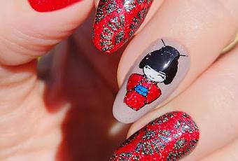 La estampación la hice con un esmalte holográfico. No sé si esto ha hecho que no se vean claramente los abanicos... Según le dé la luz se distinguen mejor o peor... La Geisha es una monería 😍. Le coloreé el kimono con el mismo rojo de la base del resto de uñas, dándole un toque turquesa en el centro.