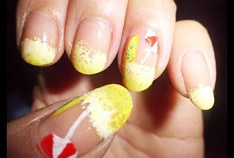 He hecho con la esponja y esmalte amarillo y blanco la limonada y la espuma, encima he pintado una sombrillita de cocktail y un trozo de limón. Me he dado cuenta de que lo he pintado al revés, pero no importa.