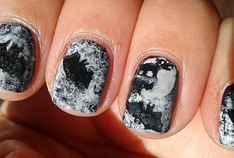 - Con un plástico transparente mojado con un poco de esmalte blanco da unos toques sobre el negro. Deja que seque bien.