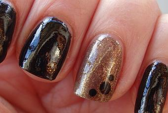 - Una vez seca esta capa, da una capa de esmalte marrón oscuro en cuatro uñas , deja que seque y da otra capa del mismo esmalte.
