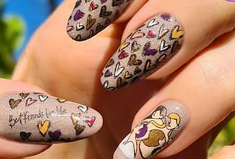 Sobre una base nude holográfica coloqué reverses (estampando con un esmalte holográfico). La uña protagonista es la del anular, donde estamos representadas nosotras cuatro 😆 En la uña del pulgar tenemos la frase "Friends for life" (amigas para siempre) con corazoncitos y el resto de uñas repletas de corazoncitos de colores 💙💚💛💜.
