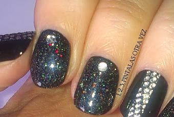 A mi me ha gustado el resultado, creo que queda una manicura festiva pero a la vez elegante. Además, la combinación de la pegatina, el brillante y la purpurina me gusta como queda... Una vez se ha secado todo, aplicamos una capa gruesa de top coat para que no se levante la pegatina y los brillantitos nos aguanten toda la noche.