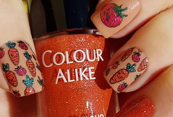 1. Prebase Complejo 7 en 1 de Revox.2. Para la base de las uñas decoradas, Kiko 220.3. Para la base de las uñas no decoradas, y para colorear las zanahorias, Ginger & Fred de Colour Alike.4. Par estampar, B. a Prince de Colour Alike.5. Placa Kawaii Emoji BM-XL322 de Bundle Monster.6. Shall Be My Queen de A England para colorear los tomates.7. Snake Prince de Colour Alike para colorear las hojitas de los tomates.8. Yesensy 085 para colorear las hojitas de las zanahorias.9. Top coat Brillo Acrílico de Brescia.Me gustó mucho esta manicura. Quedó divertida, ¿no os parece?¿Os ha gustado a vosotr@s?