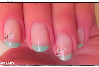 Y entre la francesa y el tono natural dibujé otra línea algo más fina, en este caso con un esmalte turquesa del kit que compré por ebay: como traen un pincel muy finito, vienen muy bien para este tipo de detalles.