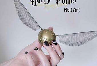 Quería que la Snitch sea blanca y dorada en una mano, y dorada y blanca en la otra.En el anular, lo que hice fue estampar en blanco y pintar con dorado algunos detalles, sobre la uña.