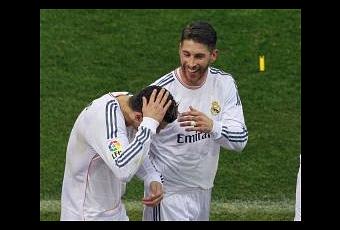 Y esta imagen la encontramos en algunos medios y es la instantánea del momento: aquí lo primero que se nos ocurre es "qué cabrón Sergio Ramos que le pegan un mecherazo a su compañero y encima se ríe".
