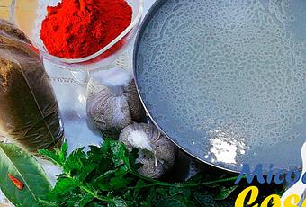 2 Mientras vamos cortando la cebolla y los ajos lo más pequeño que podamos, también cortamos la panceta o el tocino de jamón y lo reservamos. Con las especias reunidas, un manojo de perejil y hierbabuena bien cortadas, fabricaremos de forma casera una muñequilla «como si fuera una pelota de pim-pom, yo suelo hacerla con una gaza de enfermería».