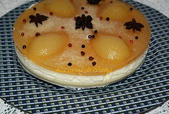 Pasadas las ocho horas de frigorífico del manjar blanco, ponemos a calentar el almíbar, sacamos las peras y lo colamos, reservando las especias para decorar. Ponemos la gelatina a remojo en agua fría. Retiramos los tallos y el corazón con las pepitas a dos peras, reservando las otras dos en un bol y trituramos en el vaso de la batidora junto con el almíbar. Pasamos de nuevo por el chino y volvemos a calentar. Añadimos la gelatina bien escurrida, dejamos que se funda bien y cuando esté templado vertemos sobre el manjar blanco cubierto con las peras reservadas partidas por la mitad.