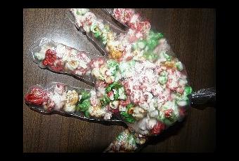 Ingredientes: palomitas de colores guantes de plásticos. Elaboración: Rellenar los guantes con las palomitas.