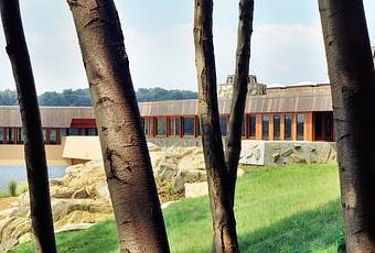 Como en muchas de sus casas, el edificio se integra en la naturaleza, se funde en el paisaje e incorpora en su interior materiales naturales originales del lugar donde se construyó.