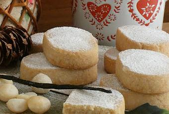 Ponemos la harina en el horno o en una sartén y la tostamos ligeramente. La dejamos enfriar. En un bol ponemos la harina, las nueces de Macadamia molidos, el azúcar glas, el azúcar de vainilla y las semillas de vainilla, mezclamos bien. Le añadimos el aceite y amasamos. Hacemos un cilindro y envolvemos en una bolsa de plástico. Dejamos en la nevera 20 minutos.
