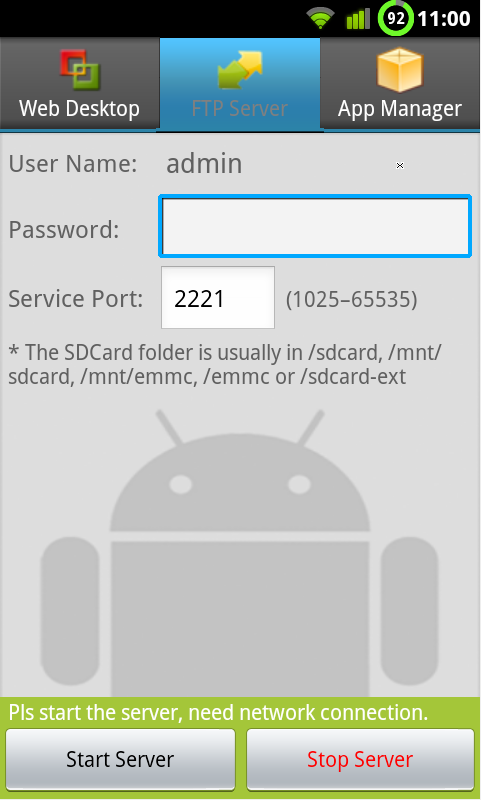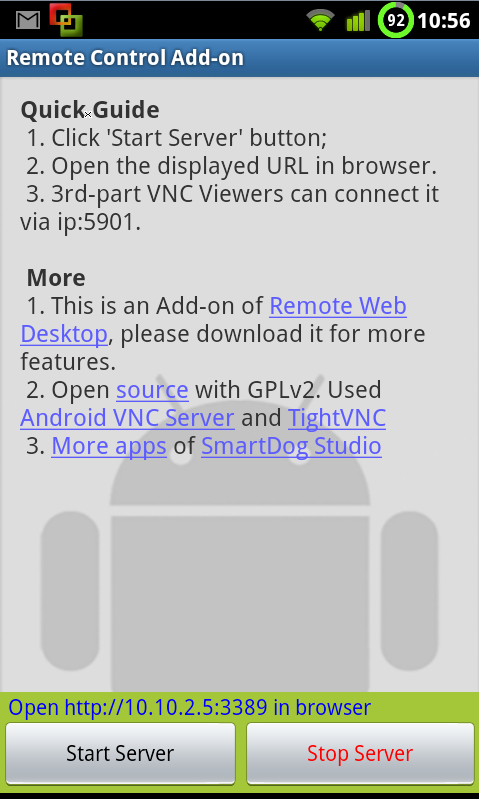 - Remote Control Add-onEl primer programa es la suite de control ya que también podremos explorar archivos, activar la cámara por control remoto, crear un servidor FTP en nuestro terminal y pasar datos (sólo la versión de pago) y un largo etcétera de funciones que podéis ver en las siguientes capturas.Esta captura es para loguearnos en el servicio ya que tiene clave de acceso (teniendo en cuenta que estamos en nuestra red local tampoco es crítico).En la siguiente captura vemos la pantalla principal que vemos desde nuestro ordenador y todas las opciones que nos permite gestionar:El programa en el móvil tiene este aspecto, nosotros tenemos la versión FULL por lo que podemos activar el HTTPS.El menú del servidor FTP lo podemos ver aquí: