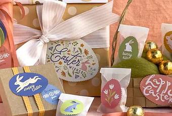 Otra diseño que te encantará son las de estas etiquetas con una variedad modelos de huevos de Pascua en colores primaverales, disponibles en diferentes tamaños que puedes utilizar para sellar bolsas de dulces y cajas pequeñas.