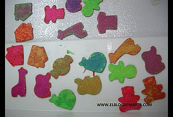 materiales: imanes, pintura, purpurina (los imanes se compran ya con formas en una bolsa de 32 figura diferentes y son bastante economicos)