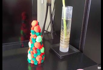 Una vez la base está pintada y seca, comenzamos a pegar los pompones jugando con los dos colores elegidos, verde y rojo. Utilizaremos cola blanca para ir pegando esos pompones.