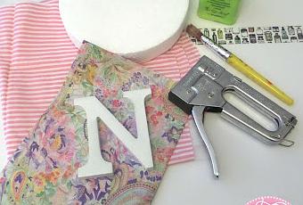 Para finalizar la manualidad vamos a pegar la inicial decorada con la técnica del decoupage encima del círculo entelado, quedando una inicial para la puerta de lo más chula.