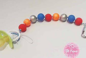 Una vez están todas hiladas, ponemos en un extremo el imperdible que sujetará el sujetachupetes a la ropa del bebe. Pegamos el sobrante del hilo de algodón de ese extremo con cola blanca al imperdible y lo dejamos secar.En el otro extremo atamos con un lazo el chupete y listo.
