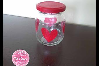 Y una vez lo tenemos todo decorado y seco vamos a rellenar el bote con chuches de corazón y listo para regalar!!!