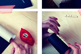2- Forra los tubos de cartón con cinta de doble cara, así quedarán muy bien fijados