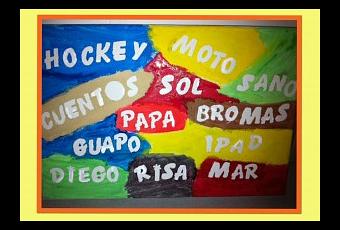 Lluvia, lluvia y más lluvia, así que mi hija me pidió hacer alguna manualidad. Encontramos un lienzo blanco y decidimos hacer un cuadro para su padre. Le dije que pensara en su padre, que íbamos a escribir las palabras que se le ocurrían, eso hicimos, Mar pensaba en cosas que le gustaban a su padre o que le describían. Tenía unas letras adhesivas que compré en “los chinos” y las pegamos en el lienzo formando las palabras, después pintamos encima y luego despegábamos las letras muy muy despacio ¡Listo!. En alguna letra se nos corrió un poco la pintura, pero la arreglamos pintando blanco encima.