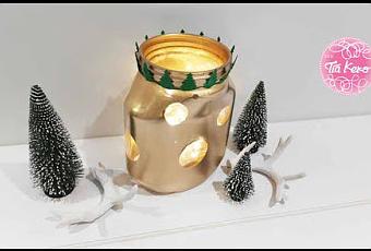 Una vez que la pintura esta bien seca, vamos a despegar con cuidado los círculos pegados y veremos como quedan ventanitas circulares por todo el bote de cristal.Ahora decoramos el cuello del bote con una cinta muy navideña en forma de arbolitos de Navidad. La pegamos con cuidado por todo el cuello del bote con la ayuda de la pistola de silicona caliente.