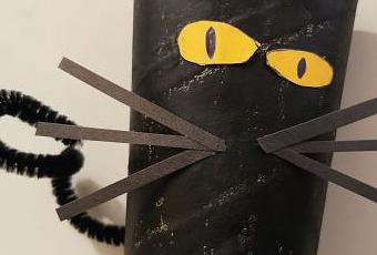 Nuestro gato está pintado con un rotulador de cera acuarelable negro, de ahí doblamos la parte superior para dar forma a sus orejas, con la cartulina amarilla le hacemos los ojos. Después pegamos los bigotes con cartulina negra y el limpia pipas como cola. Así quedó: