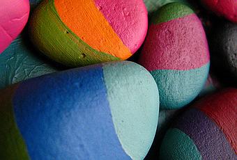 Ten en cuenta que la pintura se puede realizar en varias fases: primero se pinta el fondo, se deja secar y en una segunda fase se pintan los detalles encima de ese fondo. Para los detalles puedes hacer servir una plantilla de papel (por ejemplo para los corazones de la imagen de abajo). Basta con recortarlo en el papel, colocar el papel sobre la piedra y pintar.