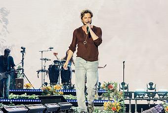 La velada se retomó con él a solas al piano y al son de Me dijeron de pequeño: "una canción muy especial, todavía no me creo que esté en Madrid tocando en un sitio como este, con emoción, lo más bonito del mundo". Y si esa era especial, la siguiente Y ahora también al piano fue de categoría especial. "Un pasito más, que sí se puede, uno y otro más, mujer valiente. Lo que diga está de más, ya sé que quieres gritar y no te sientas sola, contigo estoy. Todas las luces del mundo iluminan tu vereda y cada herida la llenan con el amor más profundo. Pero si la noche es larga y sientes que estás perdida, recuerda mi melodía, que te quiere y acompaña", resultó tan emotiva Mujer de las mil batallas que incluso la emoción se vio reflejada en sus ojos desde la grada.