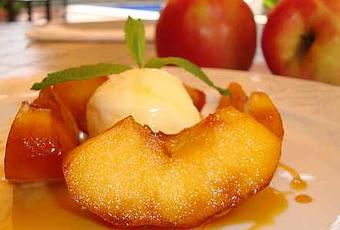 Repartimos la manzana caramelizada en 4 platos y les añadimos una bola de helado de vainilla en el centro. Podemos decorar el plato con unas hojitas de menta.