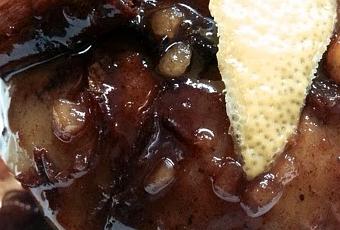 Las sacamos del aceite y en una cazuela se cuecen con el vino, el agua, la monda del limón, una rama de canela, el azúcar y las dejamos cocer lentamente durante 2 horas, dejando que se consuma el líquido par que quede como caramelo. A mitad de la cocción, preparamos una picada con las almendras y las galletas y se lo añadimos.