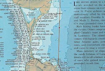 Antes de cerrar este tercio del día, una cosa que os puede resultar interesante. Un mapa de los diferentes naufragios conocidos a lo largo de las décadas y siglos en la zona del archipiélago de San Pedro y Miquelón. San Pedro y Miquelón (Saint Pierre and Miquelon,en inglés.En francés: Saint-Pierre-et-Miquelon) es un pequeño archipiélago situado en América del Norte, frente a las costas canadienses de Terranova. Desde el año 1985 es una colectividad territorial francesa con un estatuto especial. Es el departamento 975 de Francia y se trata del único territorio francés en América del Norte, un resto de lo que fue el Virreinato de Nueva Francia, que incluía otros territorios como Quebec y Luisiana.