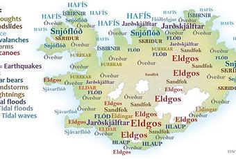 Una curiosidad la que os dejo ahora relacionada con Islandia: Aunque planteado como si fuera una especie meme o imagen graciosa, en realidad es un mapa muy útil. Doblemente útil, de hecho: Por un lado te enseña vocabulario islandés-- inglés sobre tema de desastres naturales y otro peligros naturales, y te los marca en las zonas donde mas fácilmente se dan o donde son mas comunes.