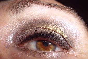 - Pon un poco de sombra gris metalica en el lagrimal y llévala hacia el centro. Difumínala. Deposita un poco de sombra dorada justo en el centro del párpado, en donde se unen los dos colores. No la he difuminado para que se vea mejor el efecto de contraste entre los colores.