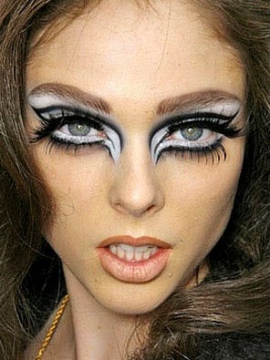 Rellena todo el párpado móvil y fijo con sombra mate de color blanca. (Los jumbos matizan mejor y fijan mas los colores).En las pestañas inferiores, utiliza un lápiz blanco y cubre toda la linea del ojo y difumina un poco para ensanchar. Finalmente utiliza el lápiz negro y subraya justo debajo del color blanco uniéndola con la de arriba.Las pestañas postizas son imprescindibles para este maquillaje. Colócalas arriba y abajo. También puedes dibujarlas con lápiz negro. Aplica dos capas de máscara de pestañas negra.Para darle mas misterio, puedes pintar tus cejas en negro.BOCA - El color puede ser desde negro, rojo, morado hasta pálido.COLORETE - Estaría bien usar sombra morada o corrección oscura para dar aspecto de palidez.