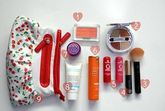 Hoy me apetecía hacer una lista de belleza,en este caso con algunas cosas imprescindibles en mi neceser cuando voy de viaje,viendo la foto me he dado cuenta de que faltan el perfume,la crema hidratante,las toatillas desmaquillantes y el desodorante.Pero bueno,esto es mas bien el maquillaje que llevo y el jabón que uso para desmaquillarme después de haber usado las toallitas.1. Colorete Smoothie Apricot de Catrice: Está descatalogado y es una pena porque es un color precioso.Tiene una parte color melocotón mate y otra mas pequeña rosa con brillos.Así que es como si tuviera tres coloretes en uno.2.Cuarteto de sombras "Teddy Brown" de Tous Colors: Me gustan estos colores y son muy naturales, para maquillarme de diario.3.Brocha de Essence: La uso para el colorete,me gusta porque es muy suave.4.Minitalla de máscara de pestañas de Estée Lauder: Creo que me vino en una revista,no me acuerdo.Una mini máscara viene bien para llevar de viaje y además me encanta como me deja las pestañas,largas y tupidas justo como a mi me gusta.5.Lip balms de la edición limitada "Oz,the great and powerful": Me compré los dos y no me arrepiento.Me los aplico muy a menudo porque me hidratan los labios y me encantan los colores. El rojo me deja los labios en un tono fucsia gloss muy bonito y llamativo y el rosa es mas discreto.6.BB Cream Vital Orange de Skin79: Esta es la versión mini de mi BB Cream favorita de la que os hablé aquí.7.Corrector Erase Paste tono 01 de Benefit: La uso para las ojeras porque es algo graso y yo tengo el contorno de ojos muy seco.8.Jabón de Skin79: Este jabón venía en un pack con un mini gel de ducha y un mini peeling.Lo uso siempre que voy de viaje porque es muy suave y limpia muy bien los restos de maquillaje.9.Neceser de Blanco: Lo tengo desde hace años,es de plástico pero muy duradero.Tiene dos bolsillos y me caben todas estas cosas y alguna mas. Llevo uno pequeño porque si no llevaría muchas mas cosas y no es plan.