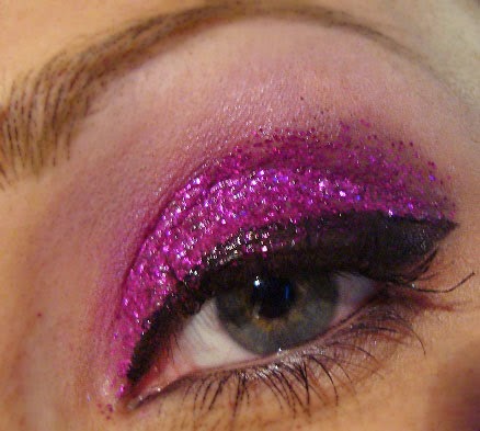 Aplico un poco de Gloss pegajoso en el dorso de la mano y muy poco a poco, empiezo a mojar la purpurina y lo voy aplicando despacio en el ojo. Una vez aplicado, pasaremos el eyeliner nuevamente.