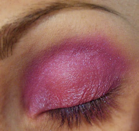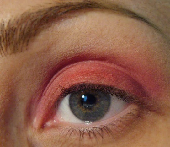 Aplico en todo el ojo, jumbo blanco o base blanca y difumino con el dedo. Con el pigmento rojo de Mac "Basic Red" Número A 73, relleno todo el párpado móvil. Eso hará que le de intensidad al color que aplique después.Encima del rojo aplico pigmento Bright Fucsia deMac