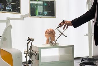 Foto: Ranier Birkenbach, el vicepresidente ejecutivo de Brainlab, demuestra el sistema Curve de cirugía dirigida por imágenes en un modelo de cerebro. La digitalización y la ciencia de datos complementan sectores como la medicina donde el profesional aun no puede sustituirse