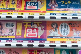 El caso es que caminando sin rumbo fijo por Nagasaki me encontre estas máquinas expendedoras de O'mikujis, aunque mas que papeles o amuletos de la suerte son objetos un poco mas "curiosos" como podeis ver en las fotos...