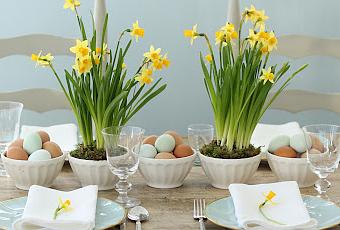 Semana Santa que me ha encantado: unos iris plantados en unos cuencos y unos huevos coloreados....y el detallito de la flor en cada una de las servilletas.