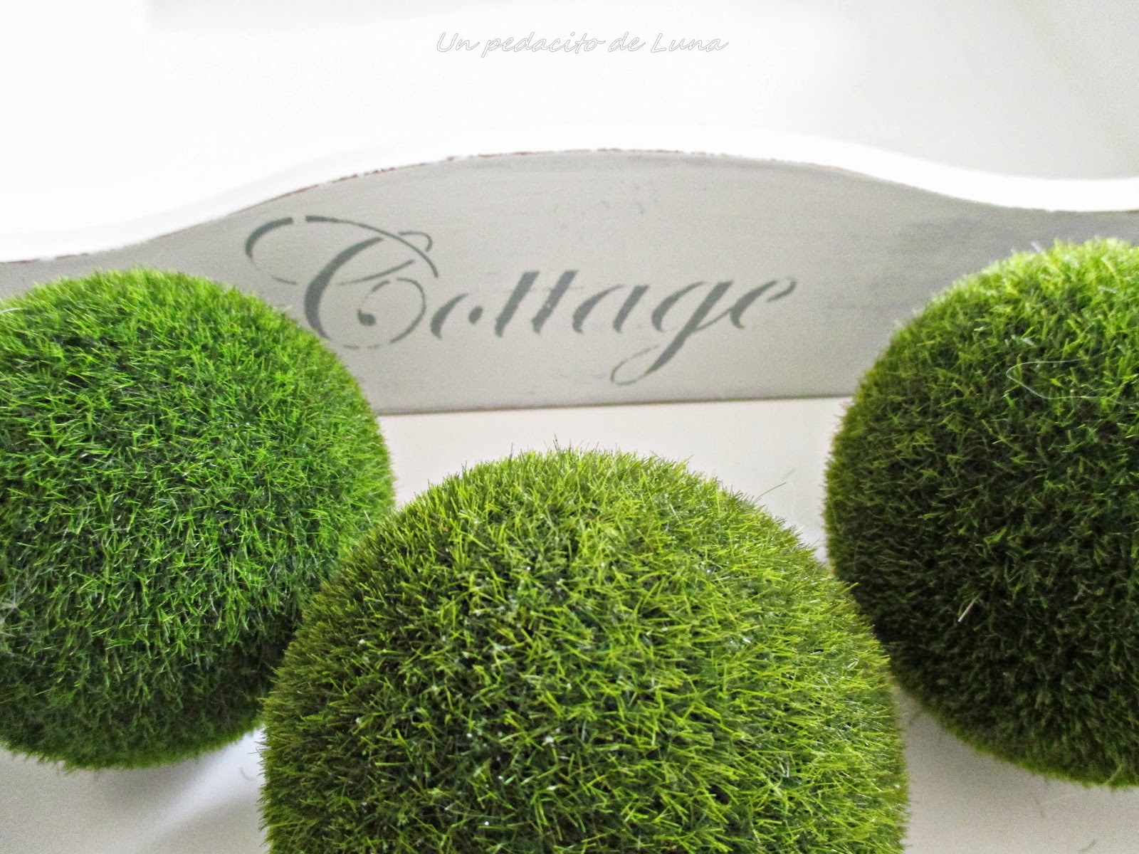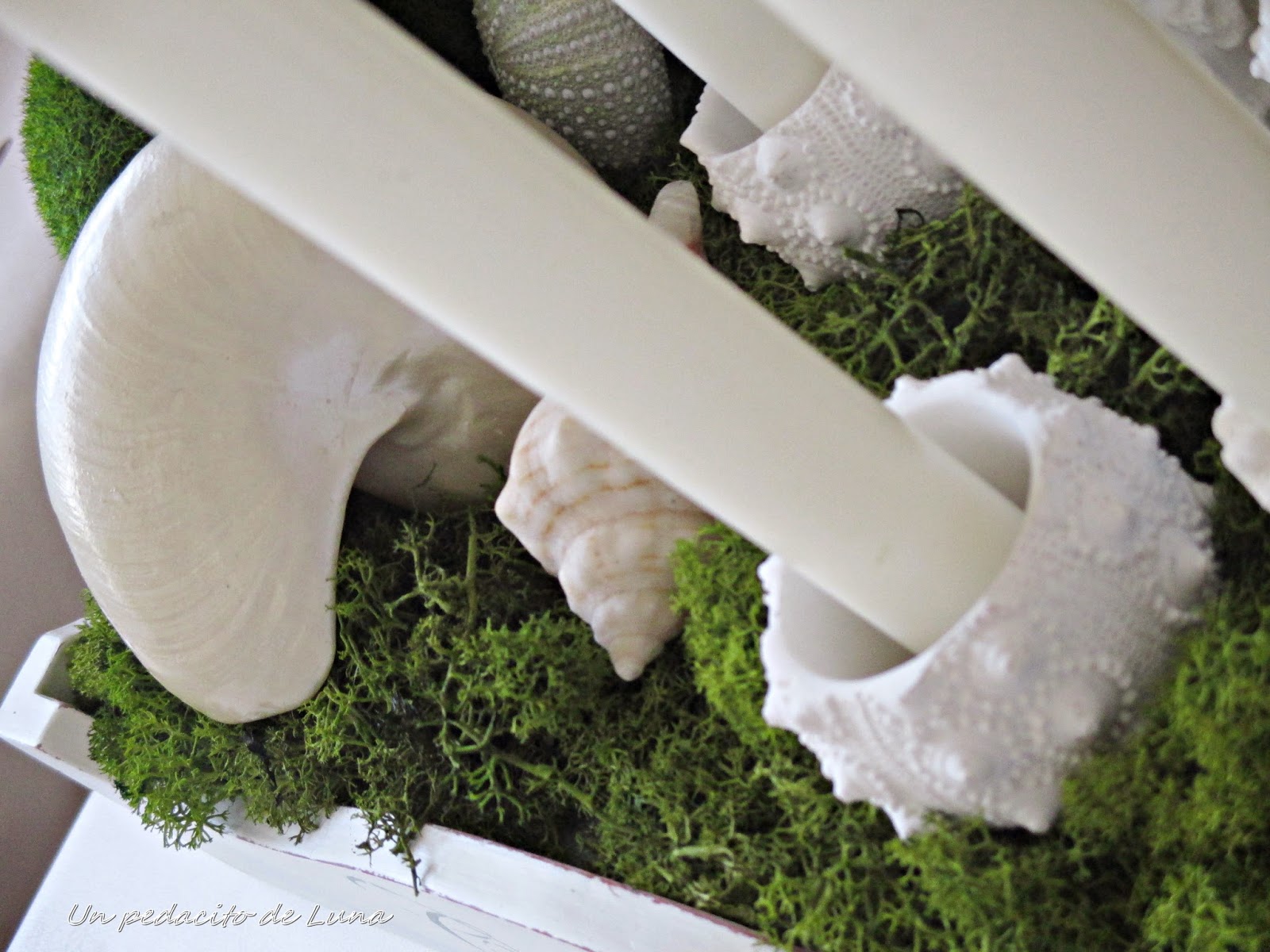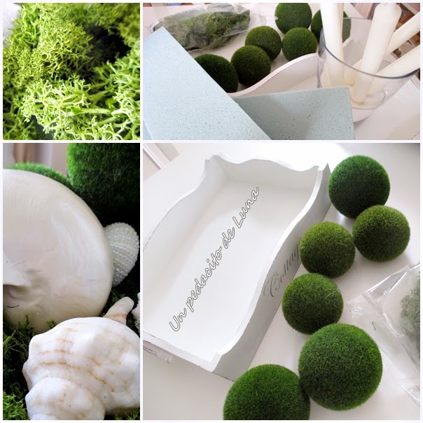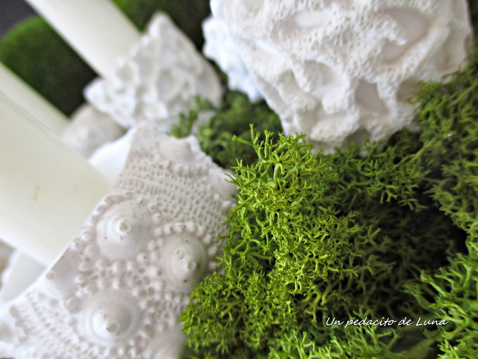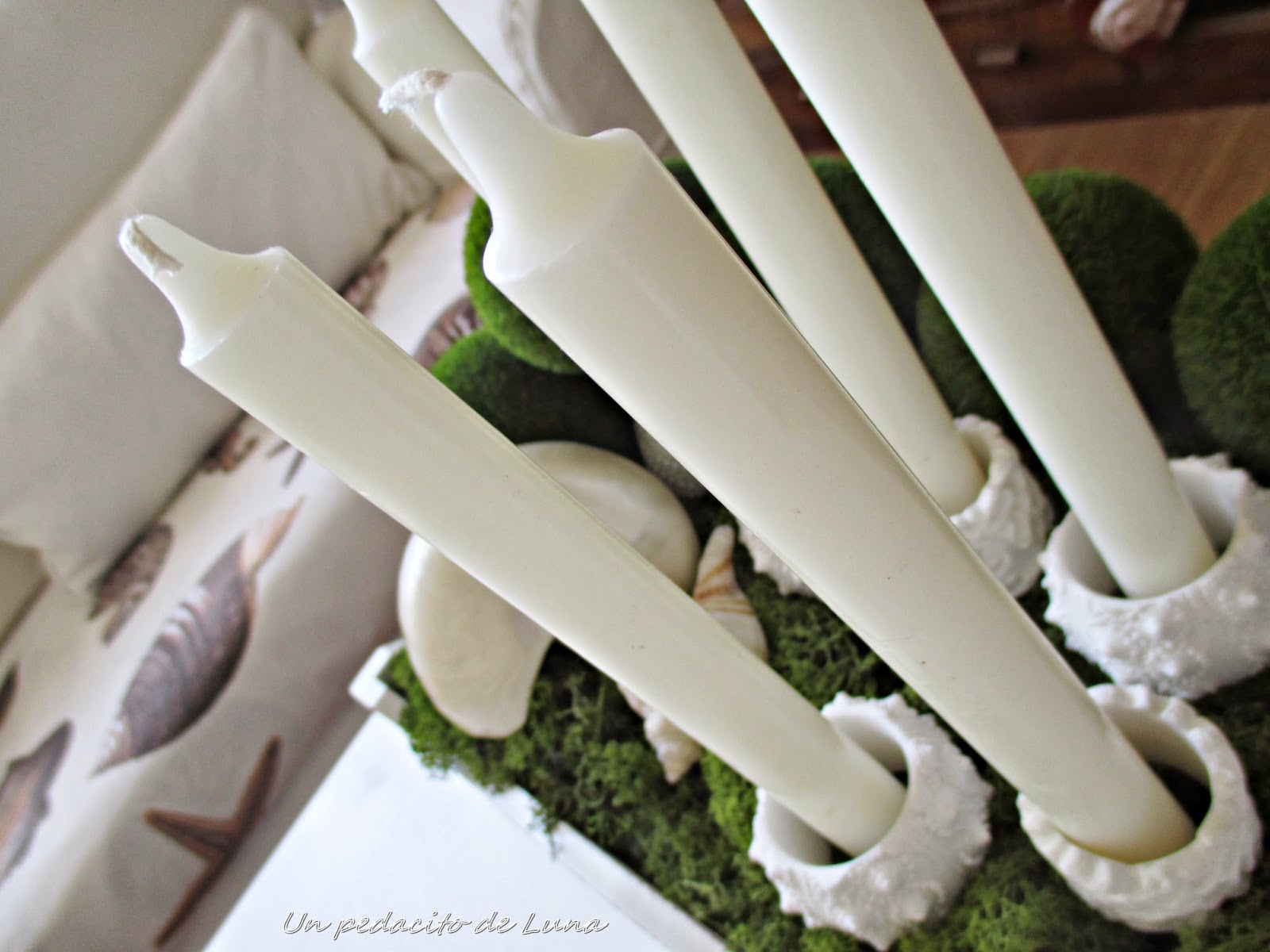 Con una bandeja, una plancha de espuma rígida de floristería, bolas de porexpan vestidas de verde, musgo restante de la pasada Navidad, y unas velas, he formado un centro que me regala la frescura de la primavera y el aroma del mar.