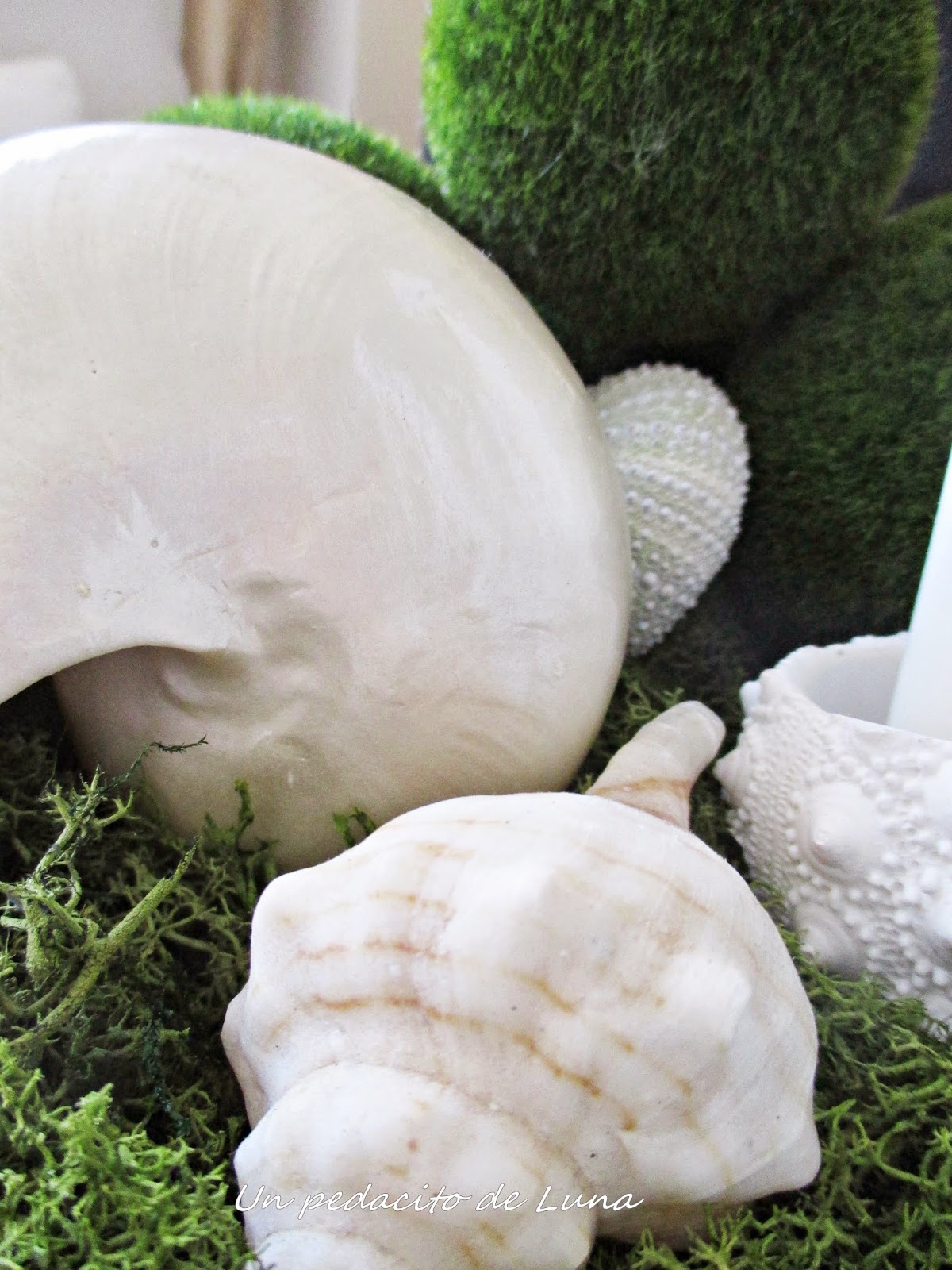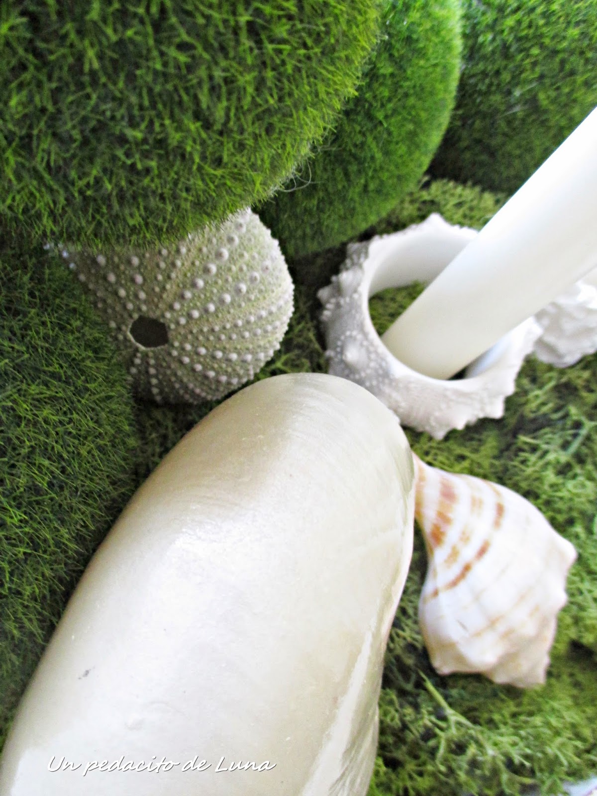 Clavé las velas en la espuma y las coroné con unos servilleteros marinos de la colección de Zara Home para esta primavera, coloqué las bolas de porexpan formando una barrera y dejé caer las caracolas, y un erizo de mar sobre el musgo.