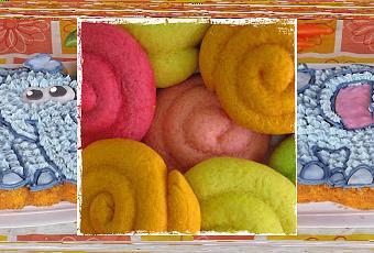 Y lo más divertido de todo, el experimento con los colorantes. Y cuando digo experimento lo digo en serio, porque no sabíamos qué tal cogería el color esta masa, y además las mezclas de colores las hicimos completamente a ojo. Así, algunos colores salieron geniales y otros un poco caca (nunca mejor dicho, con esa forma, jajaja...) La próxima vez haremos una tesis sobre colorantes antes de meternos en estos jardines...