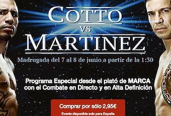 Nos espera una gran noche para los aficionados al boxeo. El combate entre Sergio “Maravilla” Martínez y Miguel Cotto, el combate del año, lo podremos ver en directo en la web Marca.com esta madrugada a partir de la 01:30h.El programa comenzará desde el plató de Marca y tras una previa y análisis de la velada se conectará con el Madison Square Garden de Nueva York para seguir todos los combates en directo.Allí estarán los presentadores de Marca TV, Jaime Ugarte y Emilio Marquiegui, junto a invitados de excepción.Será en PPV, pero por solo 2,95 €. Los aficionados tenemos que demostrar con todas nuestras fuerzas que entre todos contribuiremos a que los grupos editoriales españoles vean que el boxeo tiene mercado, y ello hará que se siga apostando por el pugilismo en nuestro país. La velada solo se podrá ver en España, no desde una web de fuera de nuestro territorio.En ContraNight ya hemos comprado la velada y esperamos poder disfrutar mucho más de este noble arte llamado boxeo, aunque sea por 2,95€.Amigos, en esta vida nada es gratis.¡VIVA EL BOXEO!