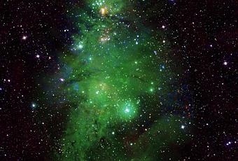 Esta imagen realza el parecido con un árbol de Navidad mediante opciones de color y rotación. Las estrellas más brillantes son estrellas jóvenes que emiten rayos X detectados por el Observatorio de rayos X Chandra de la NASA. Los datos ópticos del telescopio WIYN de 0,9 metros de la Fundación Nacional de Ciencias en Kitt Peak muestran el gas en la nebulosa en verde, correspondiente a las «agujas de pino» del árbol, y los datos infrarrojos del Two Micron All Sky Survey muestran estrellas en primer plano y en segundo plano en blanco. Esta imagen se ha girado en el sentido de las agujas del reloj unos 160 grados desde el norte estándar del astrónomo apuntando hacia arriba, de modo que parece que la copa del árbol está hacia la parte superior de la imagen.